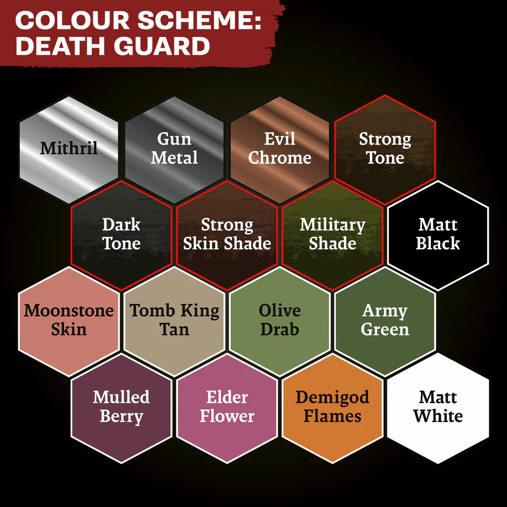 Join the Death Guard and bring the plague to your army with putrid flesh tones and corroded metals. This curated paint bundle with gleaming metallics, washes, and acrylic paint makes it simple to capture the sickly essence of the Death Guard. Whether you're new to the hobby or a seasoned pro, this bundle makes it easy to bring your army to the table and claim victory. Be sure to pair it with Tyler's step-by-step tutorial!