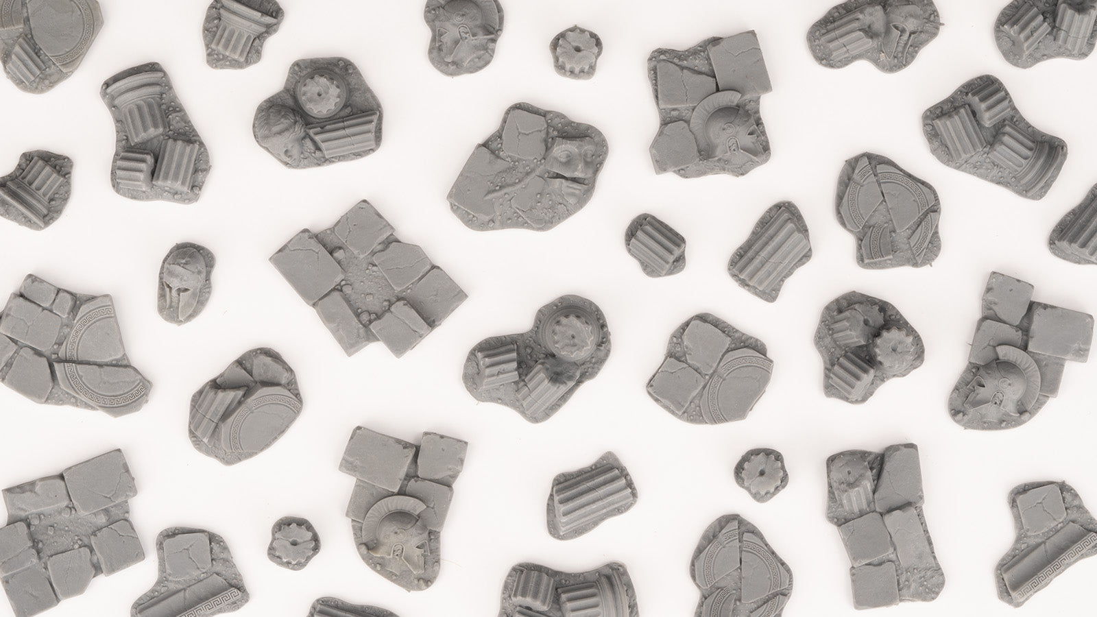 Basing Bits Temple are scaled fragments of architectural elements of a bygone ruined temple. Fragmented columns, broken pavements and sculptures, small pieces of ornamented friezes and sculptural panels, all with an antique classic flavour, are perfect for your ancient world reconstructions and sagas.