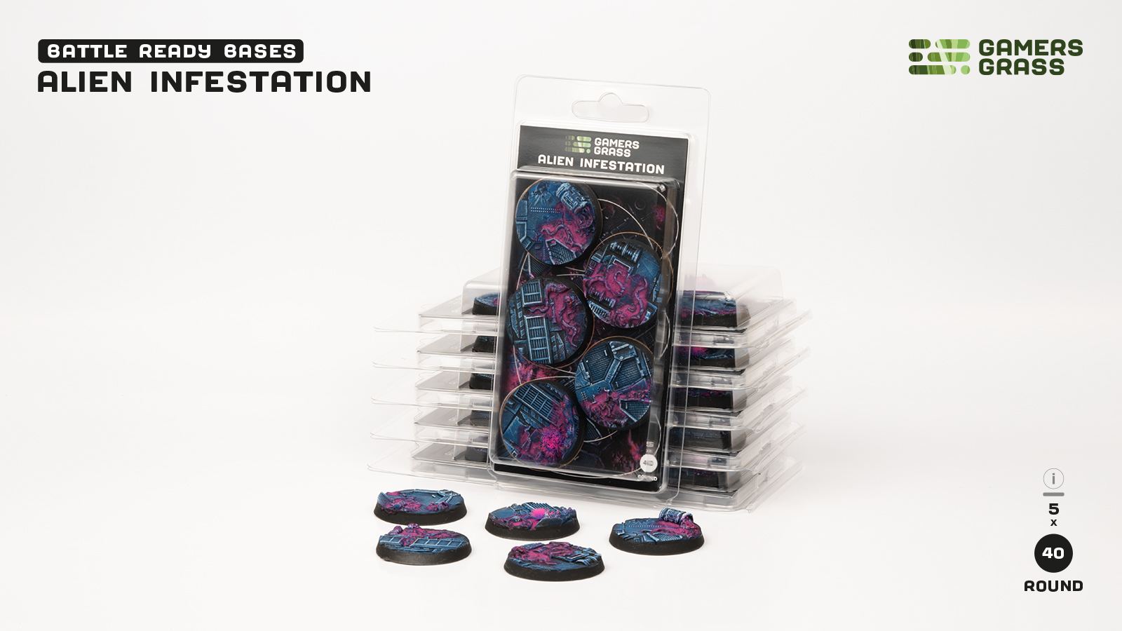 This blister contains 5x40mm wide round Battle Ready Bases, in an Alien Infestation theme.