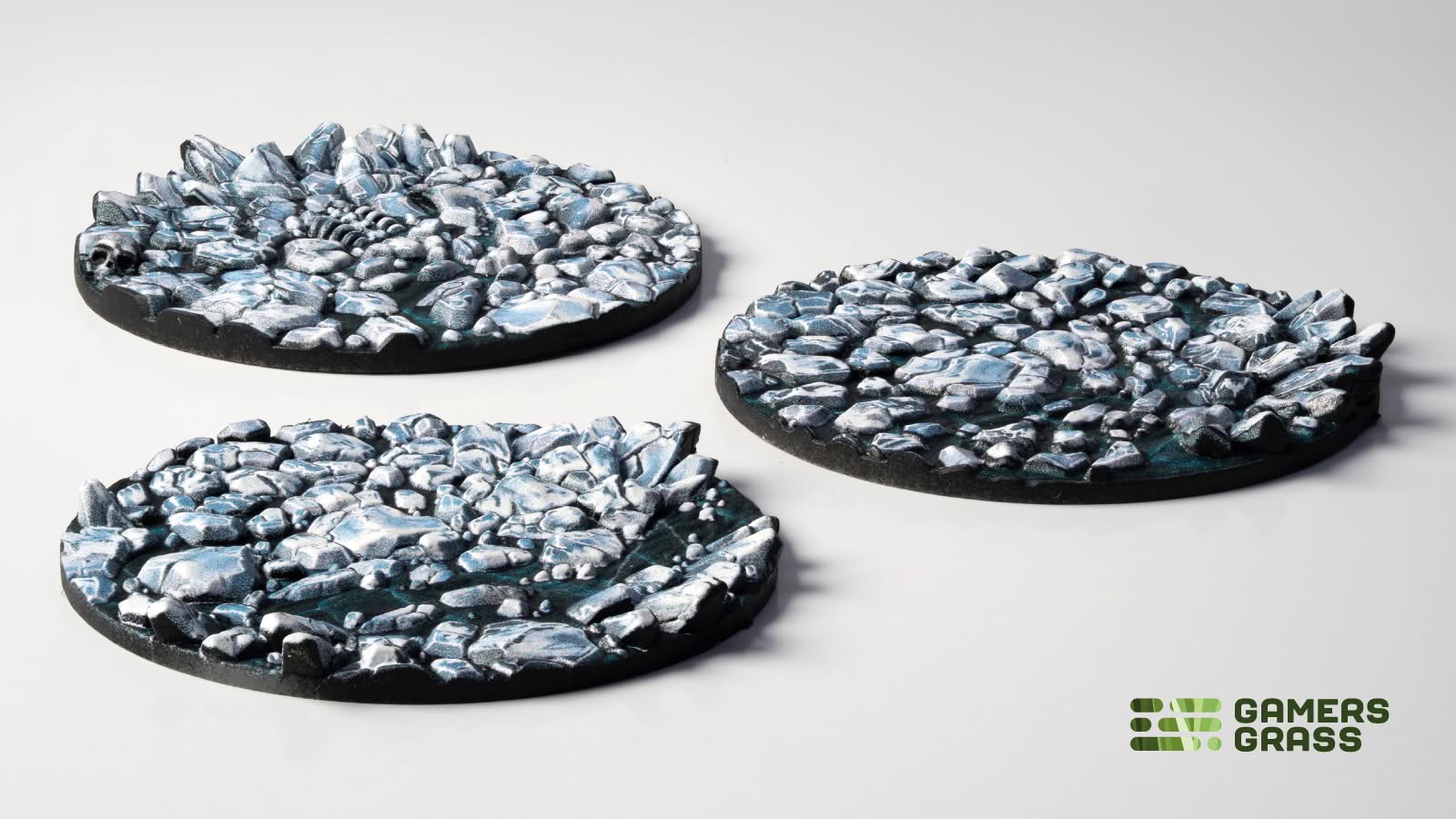 A shallow frozen lake where the ice is slowly melting away, crumbling and drifting over icy waters. Explore the northern ice-lands of your fantasy worlds, or an ice-covered planet in the far rim of the galaxy, with the “Frost Lake” theme. These toppers are ideal for basing your miniatures effortlessly, bringing your miniature heroes into perilous quests and bone-chilling scenarios. Spice up your tabletop wargames in just one step!