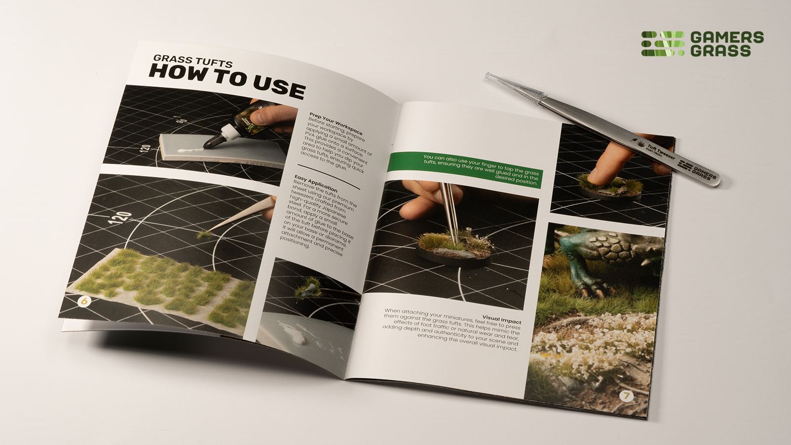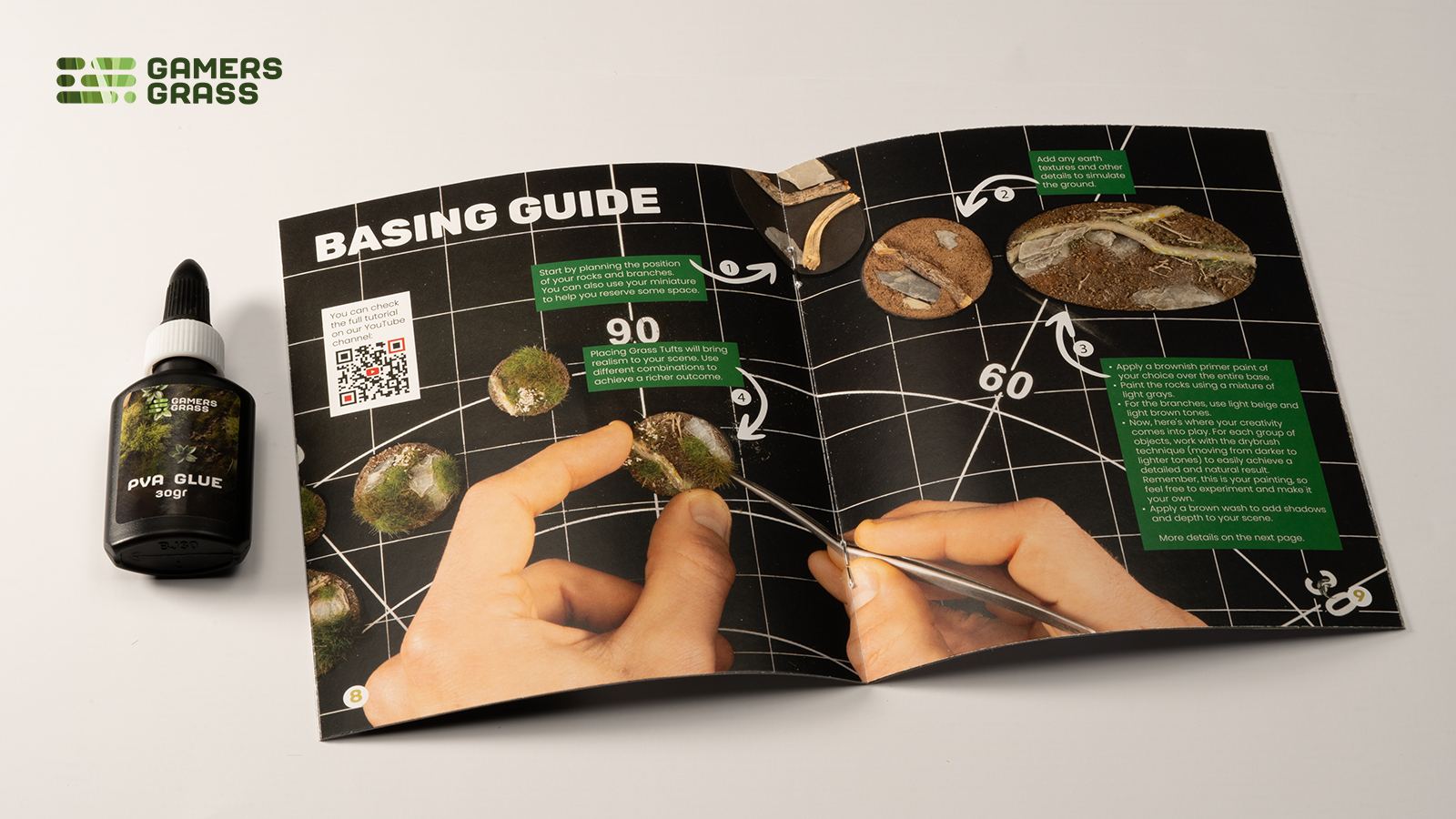 This Starter Box contains 4 full sheets of Grass Tufts, 1 Pair of Tweezers, 1 Bottle of PVA glue and 1 Basing Guide Booklet.
