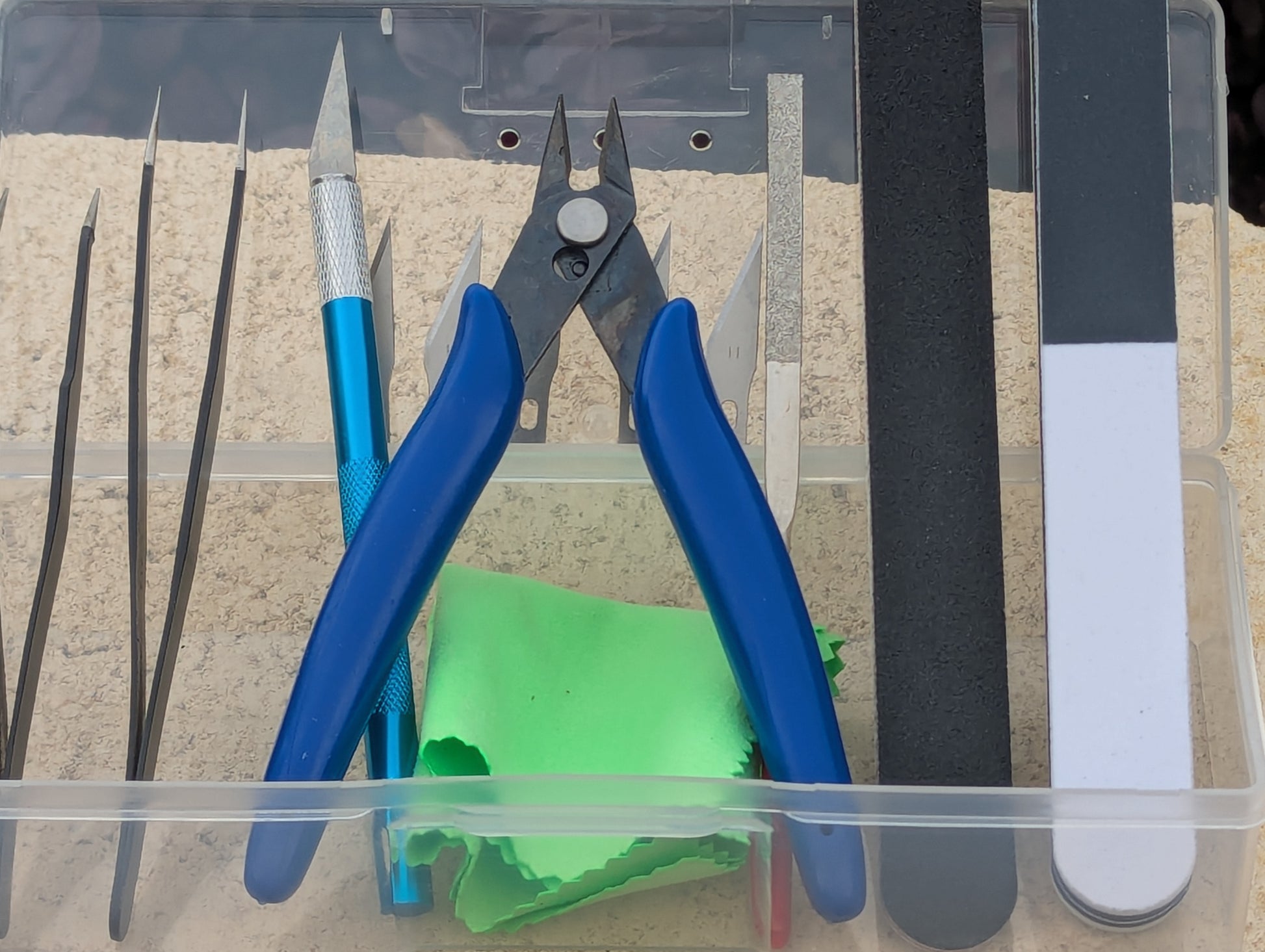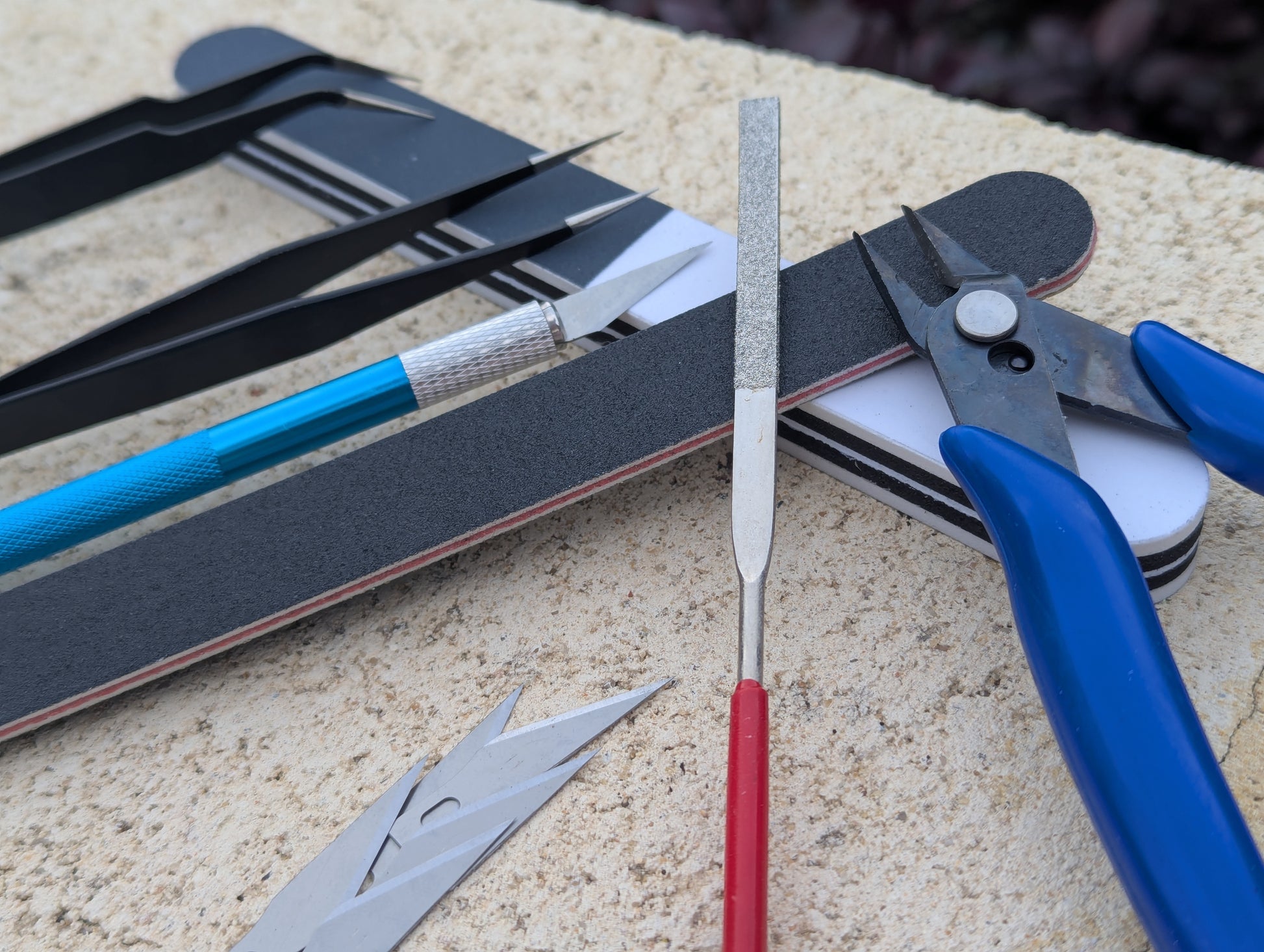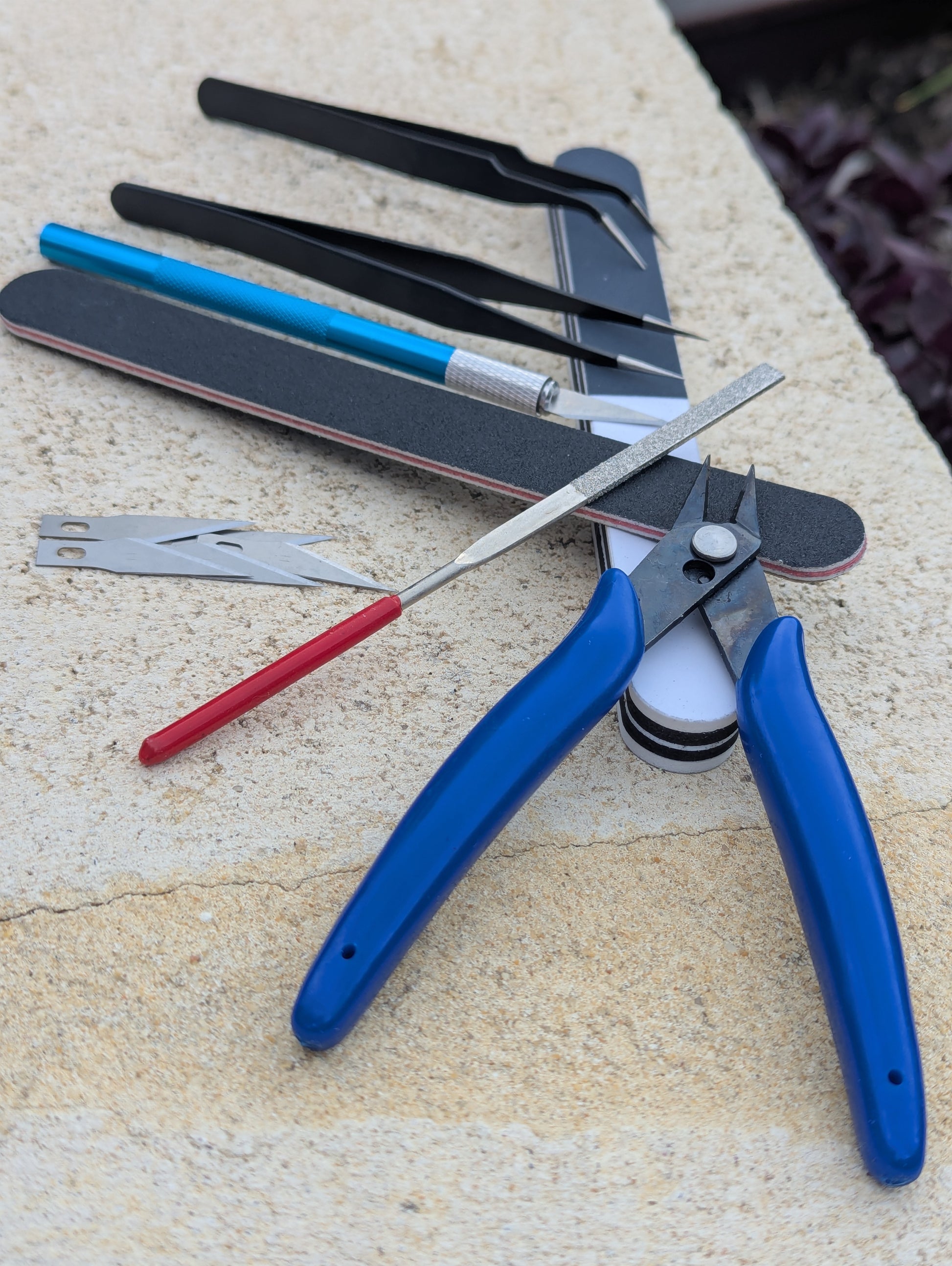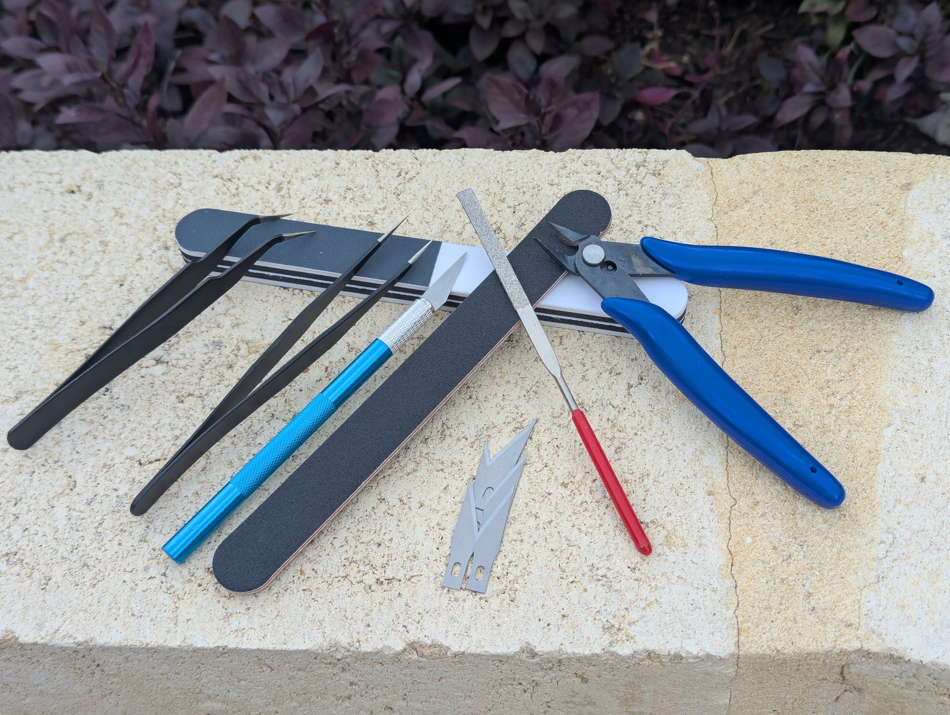 Includes: 1x Pair of side cutters, 1x File, 2x Sanding files, 1x straight tweezers, 1x bent tweezers and a hobby knife with 5x spare blades.