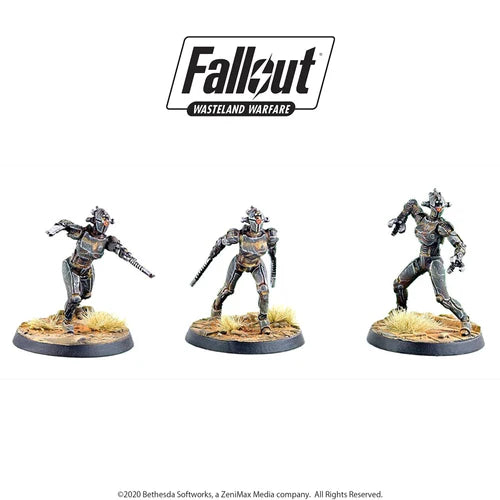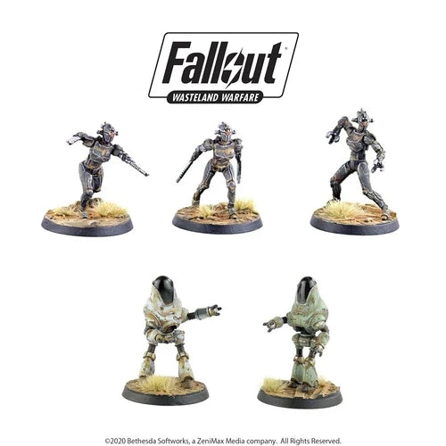 This boxed set contains five 32mm scale multi-part high quality resin Robot miniatures, each with unique scenic bases, to allow players to expand their Fallout: Wasteland Warfare games.