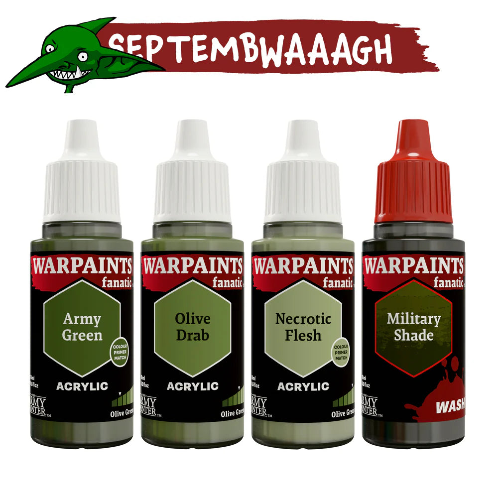 With Army Green, Olive Drab, and Necrotic Flesh, finished with Military Shade, you’ll nail that muted skin tone of battle-hardened ladz. It’s perfect for painting sneaky Kommandoz or weathered Nobz, whether you’re new to painting Orks or a longtime Ork supporta.